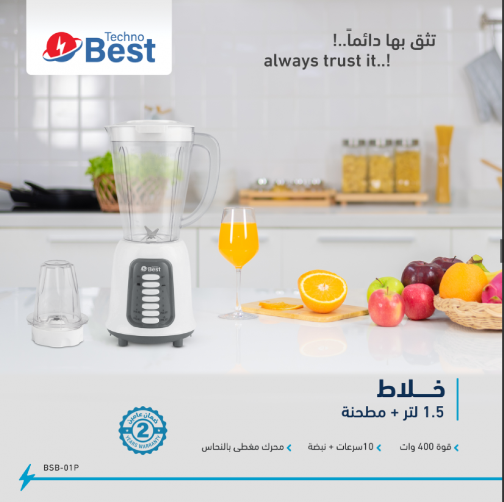 هل تبحث عن خلاط قوي وموثوق يلبي جميع احتياجاتك في المطبخ؟ حان الوقت لتجربة خلاط تكنو بيست مع مطحنة بقوة 400 واط! بفضل تصميمه الأنيق وأدائه الفائق، سيصبح الخلاط الكهربائي القوي رفيقك المثالي لتحضير العصائر والمأكولات بسهولة وسرعة.