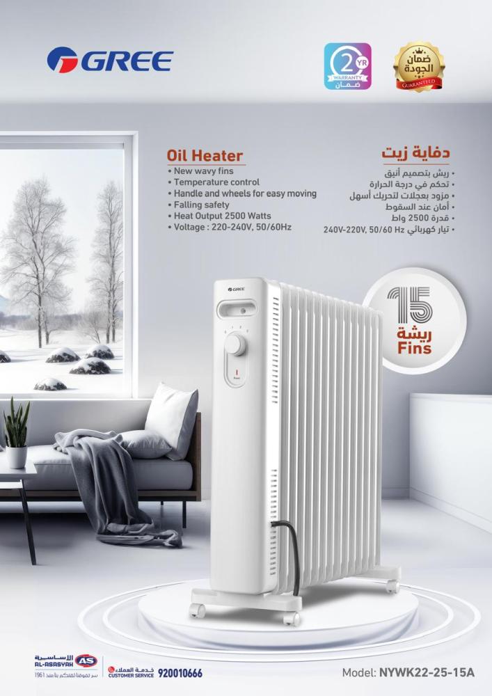 لا تدع البرودة تؤثر على راحتك وصحتك هذا الشتاء. اختر دفاية جري 15 ريشة NYWK22-25-15A، واستمتع بأجواء دافئة وجو مريح طوال الموسم.